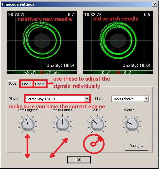 Hey guys, just want to thank everyone for their input especially beatbreaker you guys helped me out a lot with my first time setting up Serato timecode vinyl with Virtual DJ 7. My original problem was that I tried setting everything up myself and the signal was not steady at 100% and would range from 0%-100%. After I did all my settings the same as beatbreaker at page 3 where he showed screenshots my timecode vinyls sound great now at stay at 100%, even now when I backspin it doesnt sound like its losing signal and getting that crackling static sound it backspins smooth now. Even scratching now sounds great, I tried it with a few acapellas and doesn't seem to be losing signal like it did before. Also I want to mention that I am using the latest Serato timecodes with the small letters (black ones), so these were the ones that were giving beatbreaker a problem before but they seem to be working perfectly for me. Another thing I noticed was that when configuring my signal I could never get 2 circles, they would either go outside the box or look very blurry. After I did the exact setup as beatbreaker on pag3 it looks nothing like his screenshots but they stay at 100% which is strange, oh well I'm happy as hell though =) My setup was with a Technics 1200mk2, Technics 1210mk2, American Audio dv2, serato timecodes (latest) and Virtual Dj 7