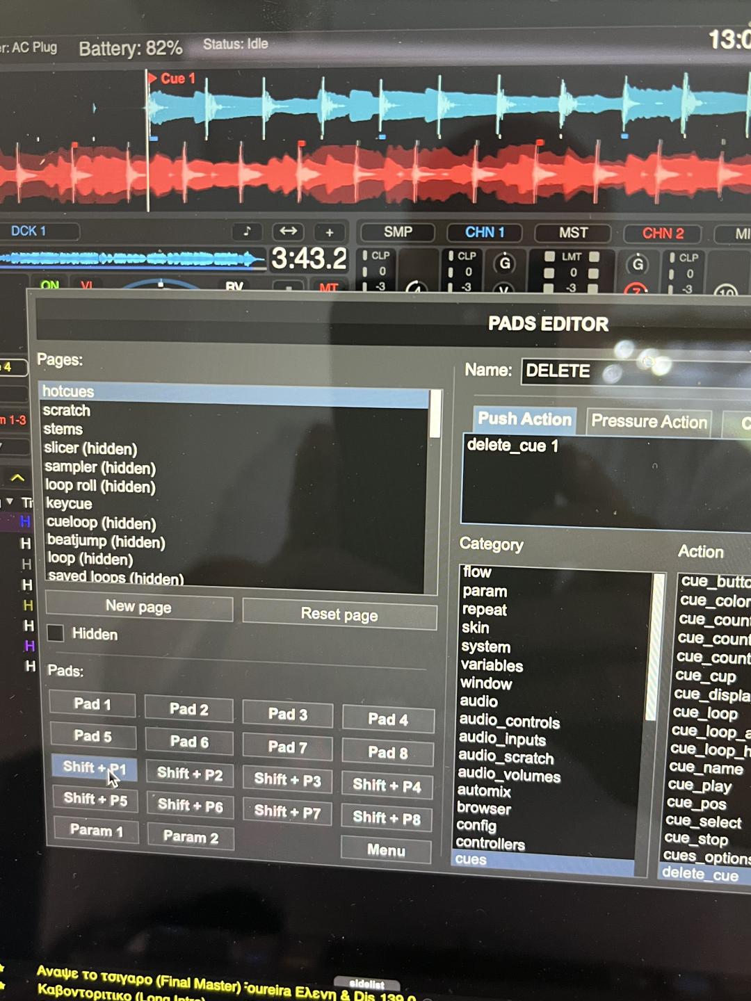 Μετά απ όλα αυτά άρχισα να πιστεύω κι εγώ ότι είναι θέμα hardware. Παρατήρησα ότι πατώντας μόνο το shift, στο σκιν δείχνει στα pads (παραθέτω φωτό) το delete, και συγκεκριμένα στο πρώτο pad που είναι γραμμένο το HC , το έχει σε πλαίσιο. Το ίδιο ακριβώς πράγμα με το ίδιο τραγούδι στο δεξί deck, και όταν πατούσα shift είχε σε πλαίσιο το HC5 (το οποίο έχω κάνει map “play stutter”). Μετά από συνεχόμενα πατήματα σαν να ξεμπλόκαρε και δούλεψε κανονικά. Πατώντας το shit πλέον και το ανάλογο HC κάνει delete. Πάμε τώρα στο πιο περίεργο. Το HC 6 λοιπόν δοκίμασα να αλλάξω εντολή για να δω τι συμβαίνει. Θυμίζω ότι κάθε φορά που πατούσα το play stutter μου έκανε play stutter στο hotcue 1. Έβαλα play_pause και μαντέψτε! Με το που το πάταγα συμπεριφερόταν σαν να πάταγα και το Hc1 μαζί. Πατάω play και πάει το HC1. Το αφήνω να παίξει λίγο. Πατάω πάλι και κάνει pause αλλά πάλι γυρνώντας στο HC 1. Λογικά κάτι έχει βραχυκυκλώσει και πατώντας το κάτω πατιέται και το πάνω μαζί. Ο φόβος μου τώρα είναι μην βγάλει και τίποτα άλλο εν ώρα δουλειας