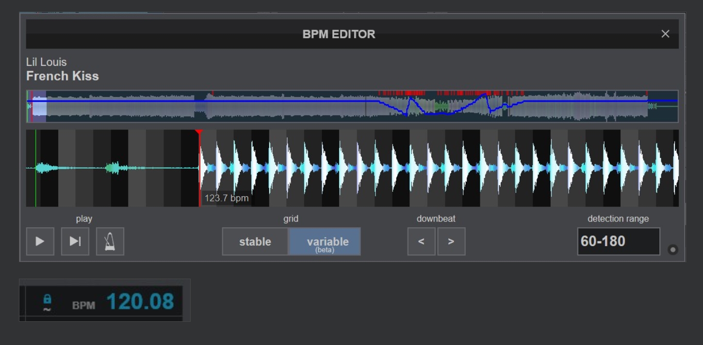 VARIABLER BEATGRID und BPM-LOCK: Eine Beta-Vorschau unseres KI-gestützten variablen BPM-Grids, welche mit allen Tracks die unterschiedliche oder variable BPM enthalten, zurechtkommt – von Old-Rock über Disco bis hin zu analogen Vinyl-Tracks oder Megamixen.