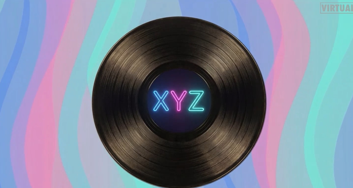 "Erstelle ein Visual mit einem DJ Logo in Form einer alten Vinyl Schallplatte. Auf dem Plattencover soll der Name XYZ im Stil von minimalistisch modernen Buchstaben in hellen Neonfarben stehen . Der Hintergrund soll dabei mit dezent gehaltenen und ruhig in sich schwingenden leicht transparenten Farbstreifen in den Farben blau, pink und türkis dargestellt werden"
