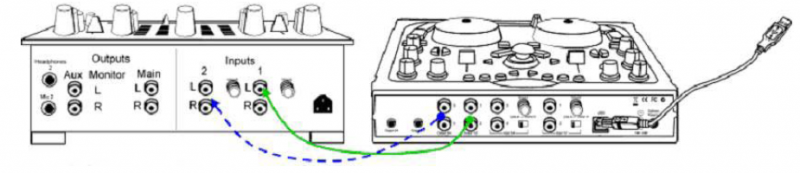 - Connectez votre mixer externe sur les connecteurs RCA Output 1/2 et Output 3/4: