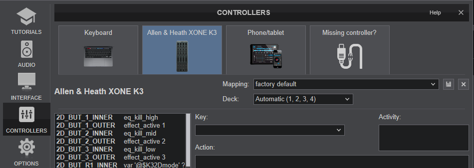 The Xone K3 should be visible in the CONTROLLERS tab of VirtualDJ Settings and the “factory default” available/selected from the Mappings drop-down list.