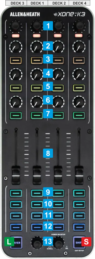 Advanced Setup ). The Deck/Channel order is 3-1-2-4 by default, but can be changed to 1-2-3-4 (See VirtualDJ Options->MixerOrder setting).