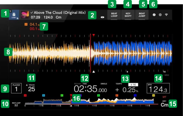 1 SOURCEIndicates the selected Source. 2 TRACK INFODisplays Track's Album Art, Title, original length and Key. Tap to hide Track's Title3 BEAT Loop Tap to show/hide a panel with quick Loop buttons on the screen4 KEY SHIFTTap to show/hide a panel with Key move/shift and Key reset buttons on the screen5 BEAT JUMPTap to show/hide a panel with quick Beat Jump buttons on the screen6 SHOW TRACK INFO Tap to get a small pop-up display with additional Track's info7 BEAT COUNTERDisplays the Beats remaining to the next Hotcue (upper text for Master Deck, lower text for Device's Deck)