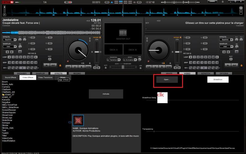 comme le montre la video a la 40 émé secondes tu dois ouvrir a chaque fois quand tu active vdj avec "open" et choisir l'effet ".svp"