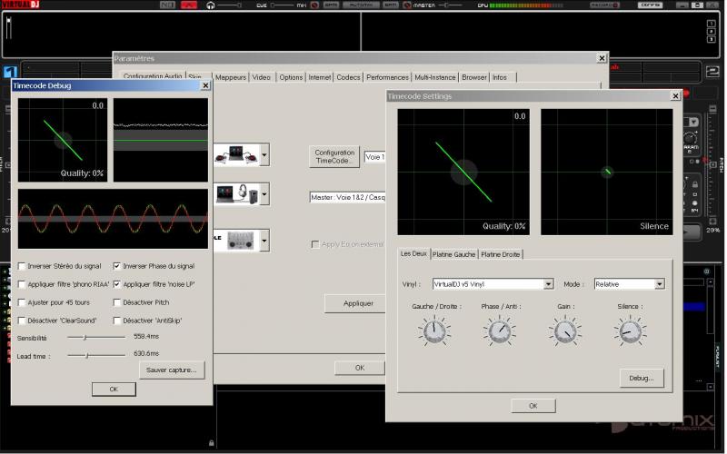 Salut à tous voici mon probleme! Je me suis procuré 2 SL1200 MK2 pour spinner. J'avais des sc35 shure et j'ai changé pour des ortofons digitrack OM et je ne peut réussir à configurer ceux-ci avec la section confi dans VDJ, J'obtiens une ligne en 45. de plus il m'es impossible de me mettre en obsolu ou smartrelative ( laptop 9410 1g ram et xp J'ai une console RMX hercule comme carte de sorti Ou est le problème????