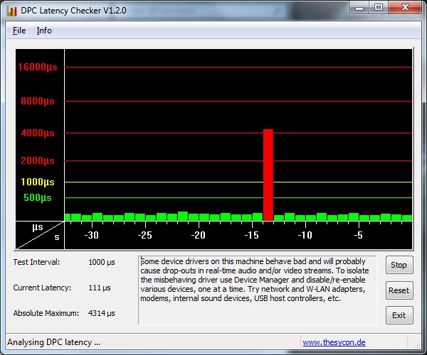 Vous comprendrez que je suis vraiment surpris et la première chose que je fais c'est d\'aller dans le device manager pour disabler le WIFI, ensuite la carte de son interne, ensuite le port FIREWIRE......oui le current latency baisse mais après un 15 min une autre barre rouge.