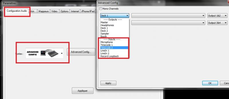 Il vous faut passer par l\'ADVANCED CONFIG dans la partie audio de Virtual DJ soit ceci :