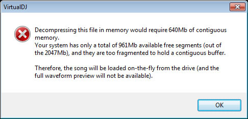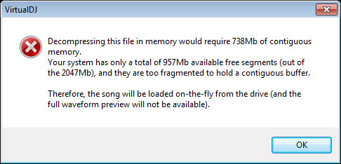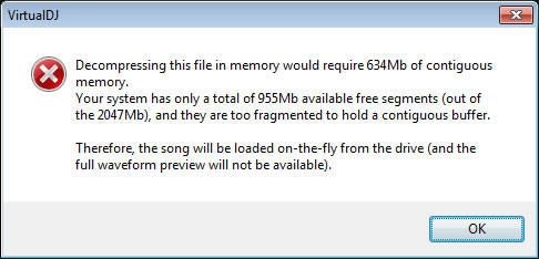 And this is funny by the way as my MACBOOK have the same problems and i have only 2GB memory on my MACBOOK computer and this message goes the same as it has a total of 122MB available free segments (out of the 4095MB) and they are too fragmented to hold a contiguous buffer, why 4095MB? when my MACBOOK has a memory of 2GB. from the VDJ get this 4095MB?