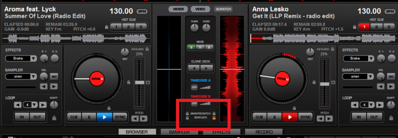le beat lock est acitivé pour le désactiver clique (dans la skin normale) sur scratch (là ou tu as mixer/vidéo/scratch) et tu verra que un des cadenas est jaune, tu cliques dessus, il devient gris , et voila!