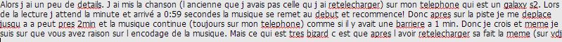 Alors j ai un peu de details. J ai mis la chanson (l ancienne que j avais pas celle qu j ai retelecharger) sur mon telephone qui est un galaxy s2. Lors de la lecture j attend la minute et arrivé a 0:59 secondes la musique se remet au debut et recommence! Donc apres sur la piste je me deplace jusqu a a peut pres 2min et la musique continue (toujours sur mon telephone) comme si il y avait une barriere a 1 min. Donc je crois et meme je suis sur que vous avez raison sur l encodage de la musique. Mais ce qui est tres bizard c est que apres l avoir retelecharger sa fait la meme (sur vdj