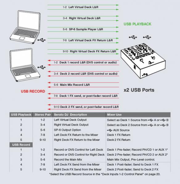 For send/return, each deck requires 2 stereo output channels and 1 stereo input channel.