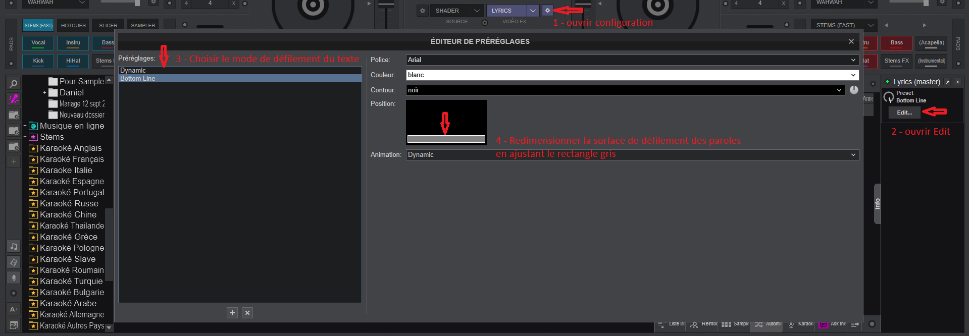 Bonjour, ayant fait plusieurs recherches afin d'avoir des informations pour les réglages de l' "éditeur de paroles" en complément de l'information transmise par "Limol" voici ce que j'ai trouvé.