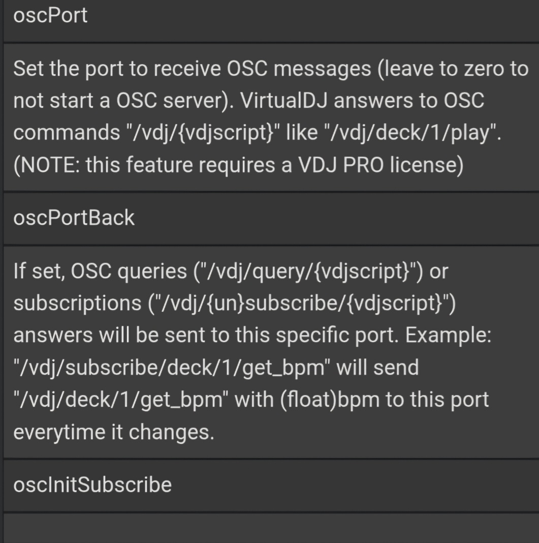It will reply with /vdj/{vdjscript} and the result as an OSC parameter. - /vdj/subscribe/{vdjscript}