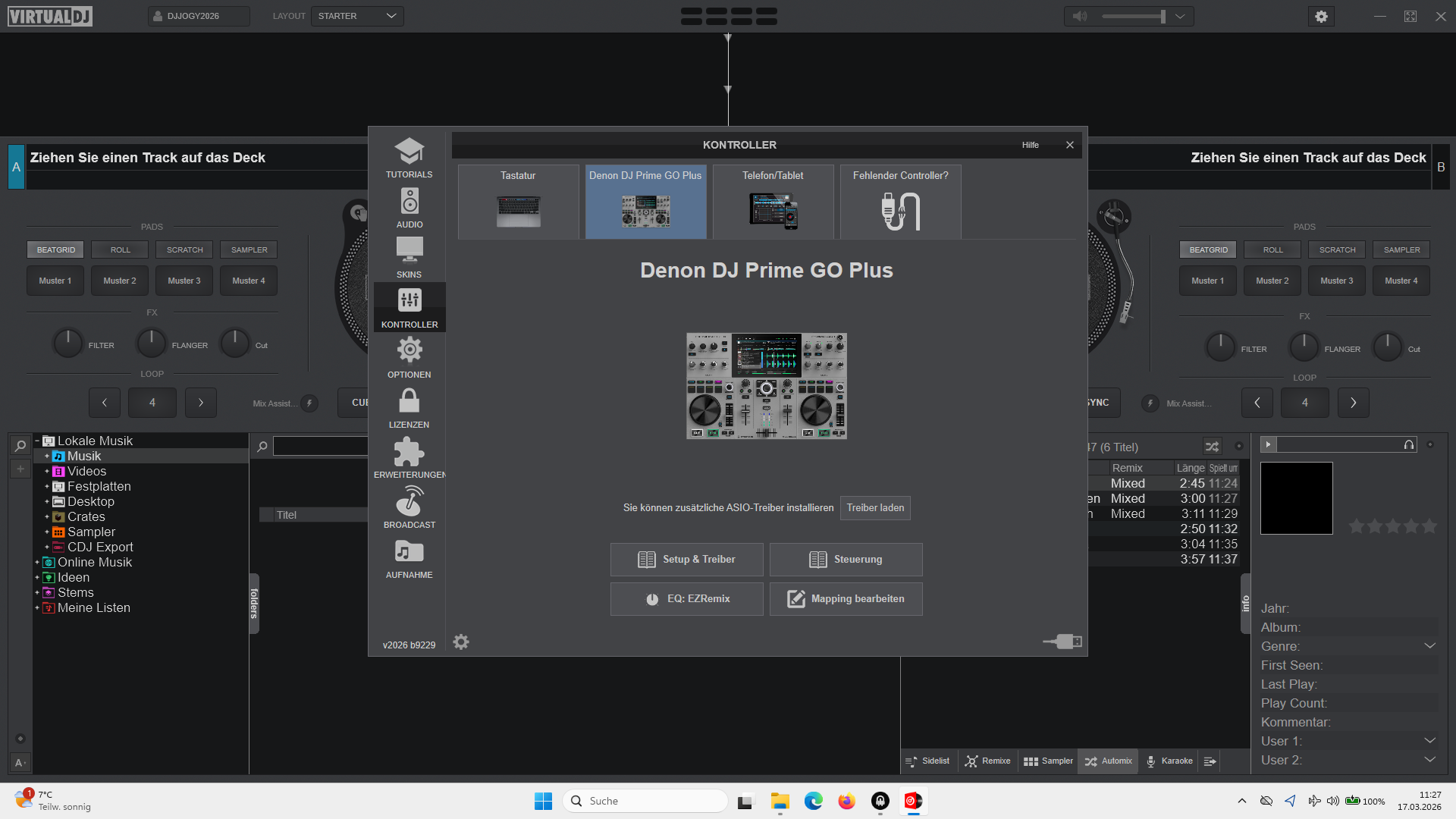 ich denke ich habe alle Treiber geladen die ich für den Prime GO Plus bei Denon finden konnte. Ich habe heute schon Über Serato Pro und VDJ Songs abgespielt, aber nicht so wie bei einen normalen Controller. Ivj habe 10 Jahre mit Serato und dem Denon MC 6000 MK II gearbeitet. Lief soweit all die Jahre ganz gut. Aber seit dem SCH.... Win 11 haben viele DJs Probleme. Ich wollte den Prime Go Plus eigentlich so benutzen wie einen normalen DJ Controller. In meiner Software, bei der Konfiguration ist er auch nicht aufgeführt. Beste Grüße Jogy