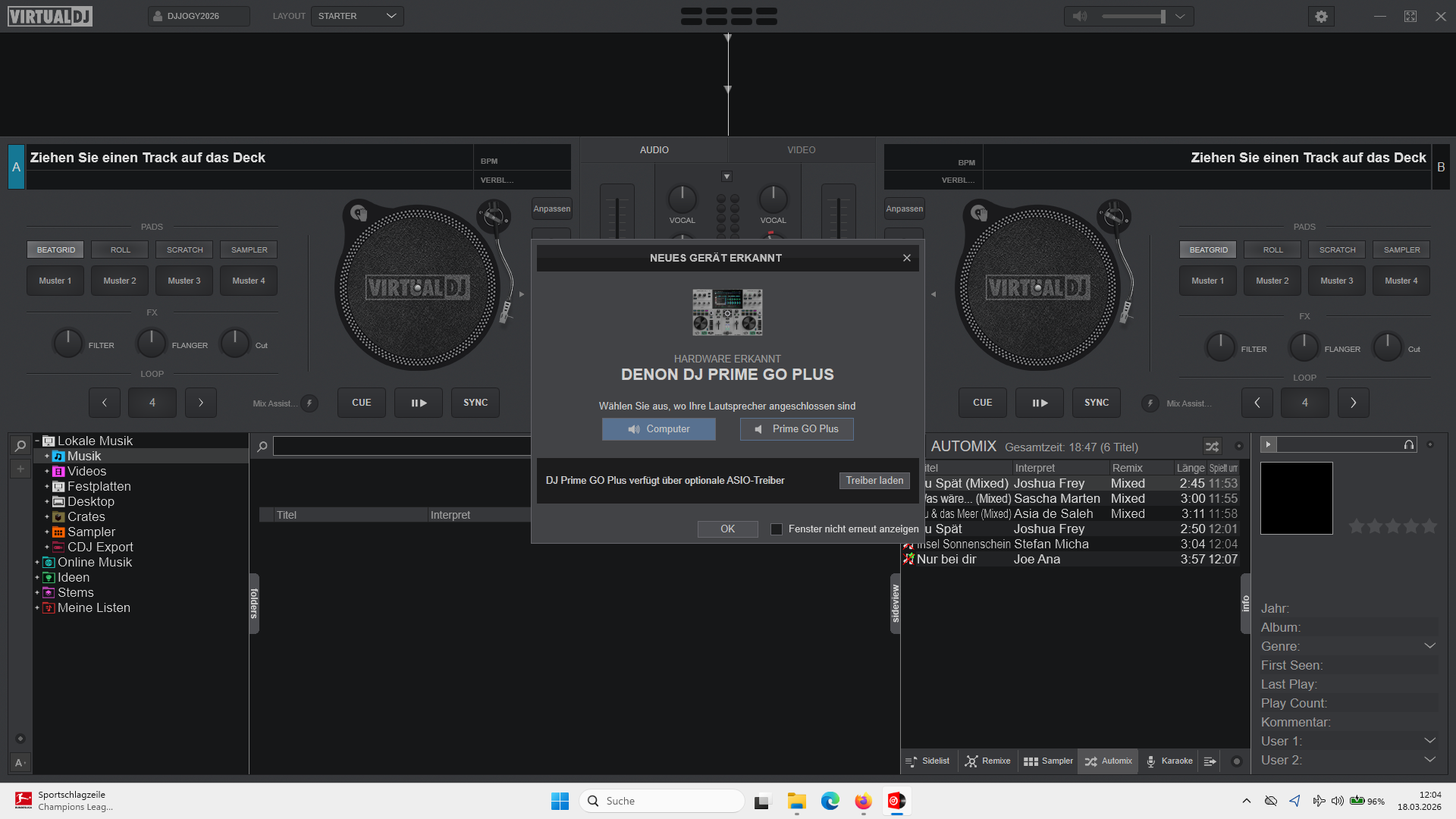 Ich habe gestern nochmal den Rechner mit VDJ an meinen Denon MC6000 MK II angeschlossen, da funktioniert alles einwandfrei. hatte nur mit Serato Pro vor ein paar Tagen Probleme bei einer Mugge. Wenn ds kleine Fenstwer werscheint von VDJ kann ich den Button rechts Denon Prime nicht anklicken. Wenn ich den Prime in den Computer Modus versetze, laufen nur ein paar Punkte ab und drunter steht STANDALONE. Mehr passiewrt sda nicht. Ich glaube, ich hatte es mal soweit, das VDJ lief und ich nur über den Master die Lautstärke regeln konnte. So war es vor ein paar Tagen mit Serato pro passiert.