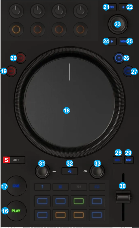 JOG: Touch-sensitive jogwheel to Scratch , bend or adjust Beat grid. When Vinyl mode is enabled, use the upper part of jogwheel to hold and Scratch and the outer part to pitch-bend.
