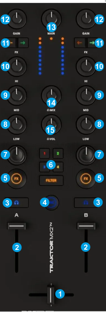 1. CROSSFADER: Blends audio between the left and right channels/decks.